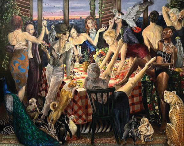 Amra Faye Wright is a South African American visual artist whose work merges Camp aesthetics with the subversive lineage of Carnival, Weimar era cabaret, Vaudeville and the British clown. Together, these traditions form a continuum of performative resistance in which humour, spectacle, and theatrical exaggeration become tools for critiquing authority and destabilizing social expectations. Drawing on these various forms as well as from her career as a theatre actress, she creates colour saturated figurative oil paintings where role playing, masking, and fractured identities unfold in fantastical scenarios. Her South African roots often surface through the presence of African animals as quiet witnesses within these heightened, chaotic worlds.